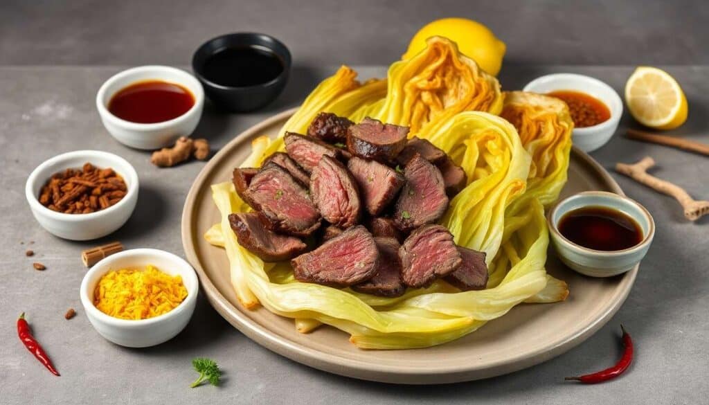 Le chou pointu épicé rôti accompagné de bœuf et de sa sauce citronnée est une recette chinoise qui allie simplicité et saveurs exotiques. Ce plat, à la fois réconfortant et plein de caractère, saura séduire les amateurs de cuisine asiatique. Grâce à cette recette, vous pourrez apporter un peu de Chine dans votre cuisine, même en utilisant des ingrédients facilement disponibles en ligne.