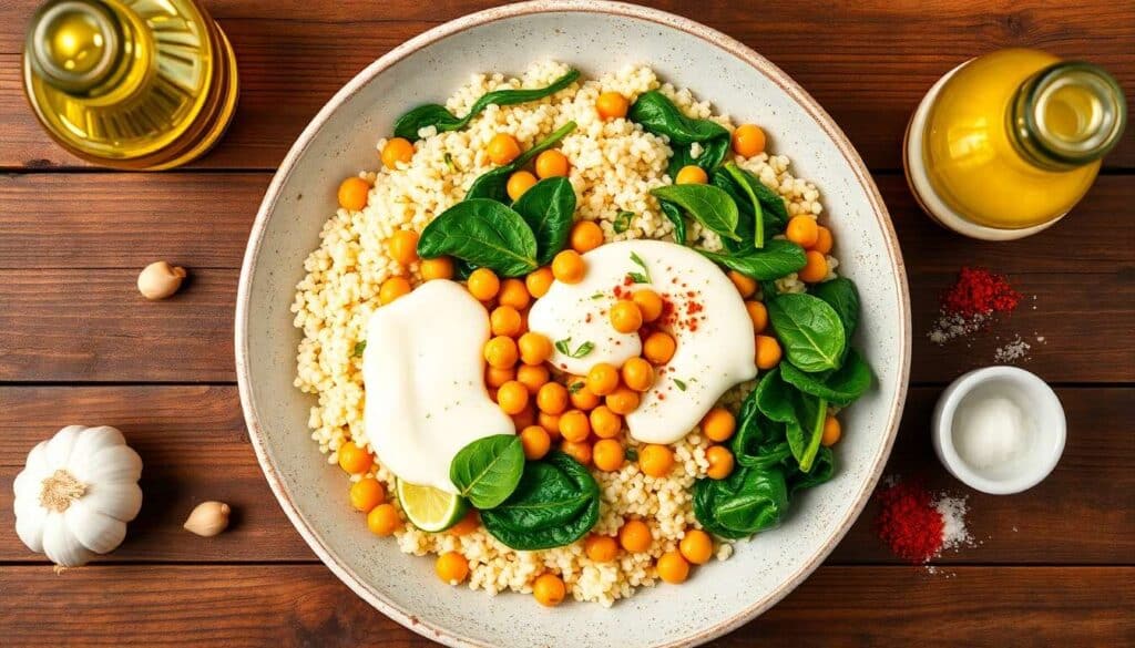 Pour les falafels, mixer les pois chiches égouttés avec les épinards décongelés, l’ail, le cumin, le paprika et la levure chimique. Former des boulettes avec cette pâte.