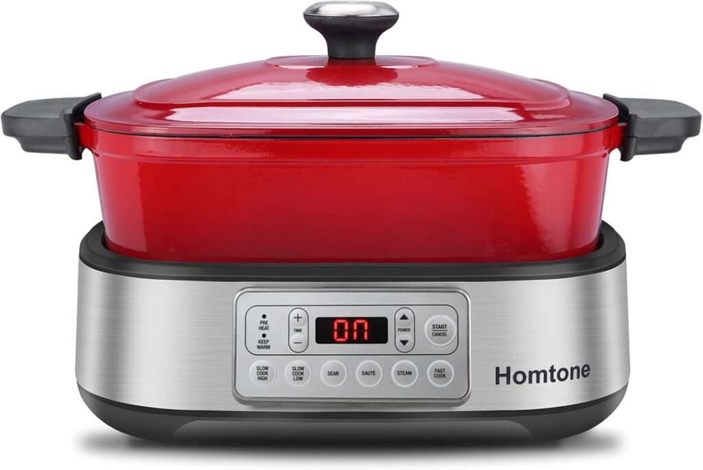 • Homtone Mijoteuse électrique 6-en-1, 5,5L Multicuiseur Cocotte Amovible en Email, Revêtement Anti-adhésif en Céramique Saine Pour Cuisson Lente, Saisir, Sauter, Cuire à la Vapeur